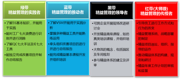 该专业团队,,,,,,,,依据能力条理分为四级:精益绿带、精益蓝带、精益黑带及精益红带。。。。。各个级别的认定,,,,,,,,必需凭证《精益生产职员资质评定标准》,,,,,,,,通过内部资质评定,,,,,,,,获得资质认可,,,,,,,,方可授予对应聘书。。。。。